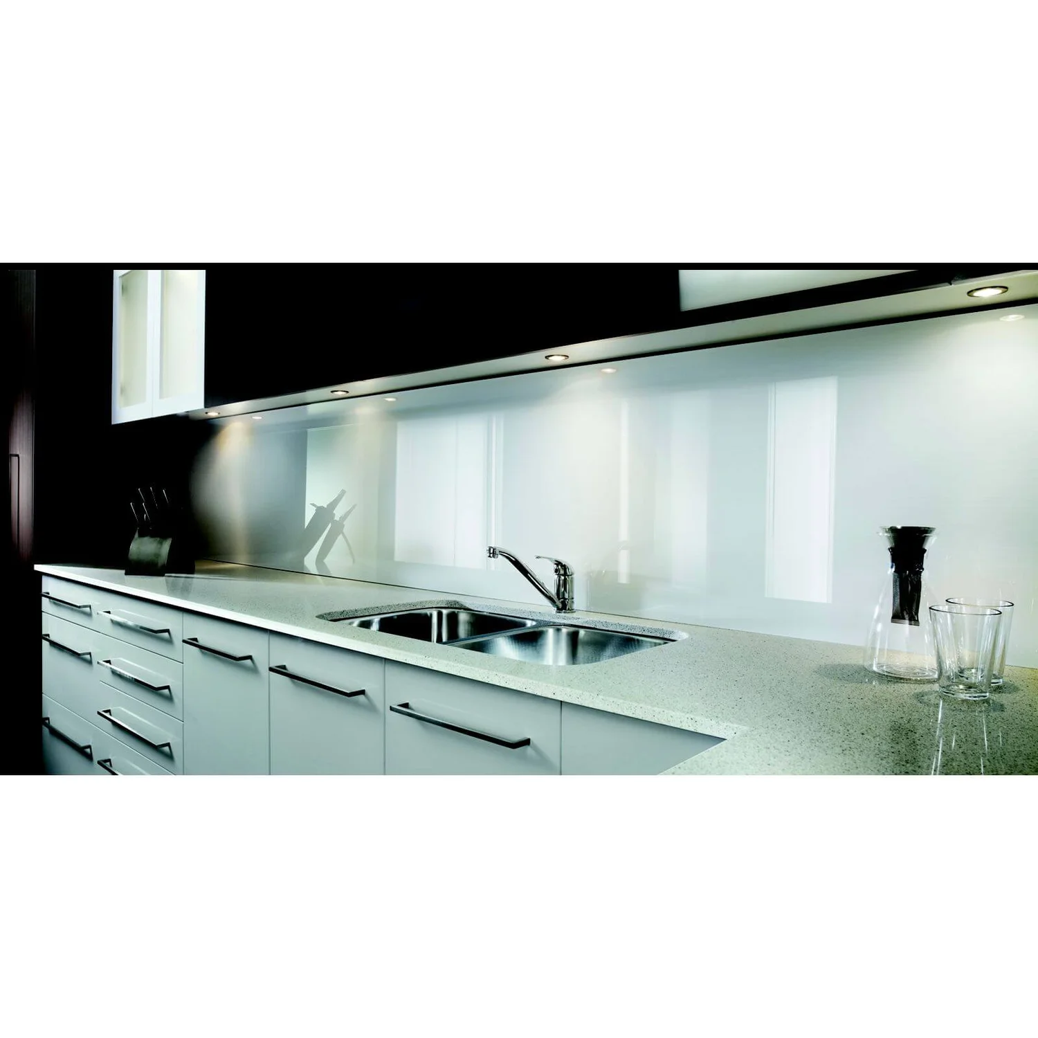 Weighing less than a quarter of a traditional glass sheet it has 20 times the impact strength. The colour is permanently fused to the clear layer and cannot be separated by moisture. Its unique hard coated surface is highly resistant to typical Kitchen and Bathroom cleaners, and offers a high scratch resistance. Zenolite is easy to work with and can be installed rapidly over new or existing wall finishes. It can be cut and drilled on site with standard wood working tools, making it very versatile. Zenolite is also very easy to maintain, with no grout and less joints. With many elegant finishes available Zenolite will transform and add colour to any Kitchen or Bathroom